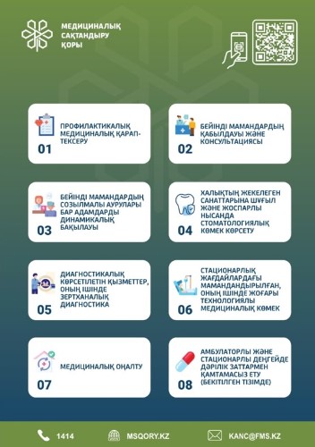 Медициналық сақтандыру қоры халыққа профилактикалық тексерулерден бастап, тар бейінді мамандардың қабылдауы мен консультацияларына, созылмалы аурулары бар азаматтарды динамикалық бақылауға, шұғыл және жоспарлы стоматологиялық көмекке қолжетімділік береді. Сондай-ақ зертханалық және жоғары технологиялық диагностикалық қызметтер, стационарлық көмек, медициналық оңалту және бекітілген тізім бойынша дәрілік қамтамасыз ету МӘМС шеңберінде көрсетіледі.