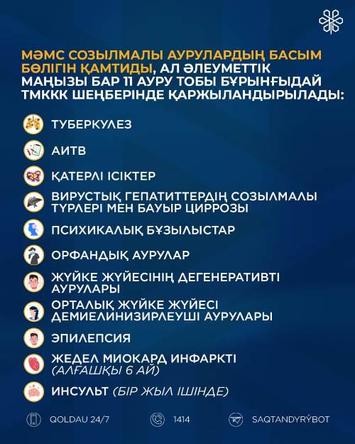 ЕНДІ МӘМС төменде көрсетілген 11 әлеуметтік маңызы бар ауруды қоспағанда, созылмалы аурулардың басым бөлігін қамтиды. Бұл аурулар ТМККК аясында қаржыландырылады: