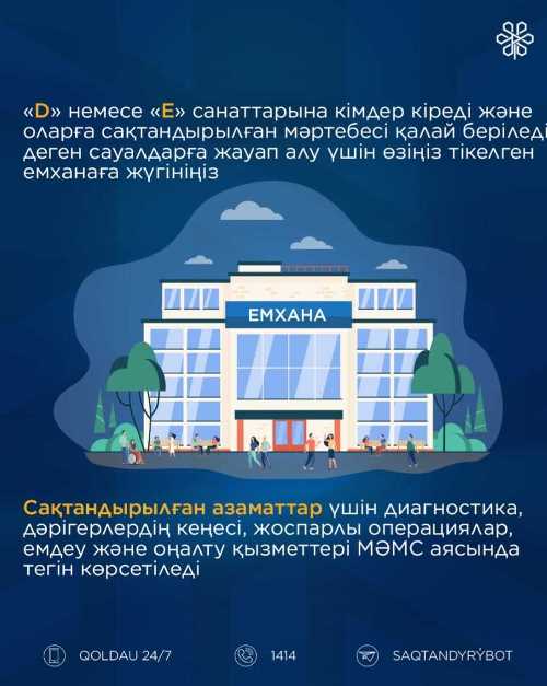 Өзіңіздің «D» немесе «E» санаттарына жататыныңызды білу үшін тіркелген емханаңызға жүгініңіз.