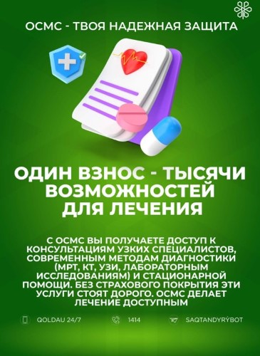 Забота о здоровье начинается с одного шага — участия в системе медицинского страхования. ОСМС предоставляет доступ к консультациям узких специалистов, современным методам диагностики (МРТ, КТ, УЗИ), лабораторным исследованиям и стационарной помощи.